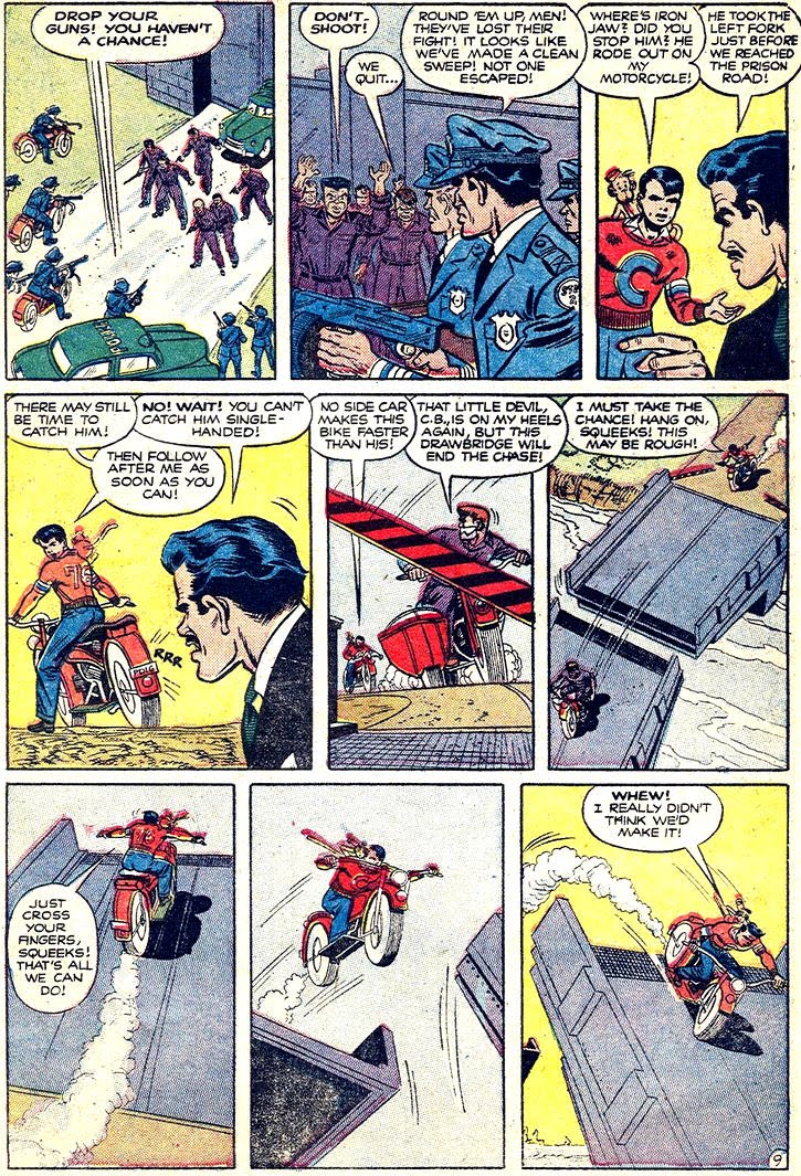 The chase is on! Crimebuster chases down the arch villain Iron Jaw in this breathless tale from Boy Illustories #69, 1951, drawn by Norman Maurer.